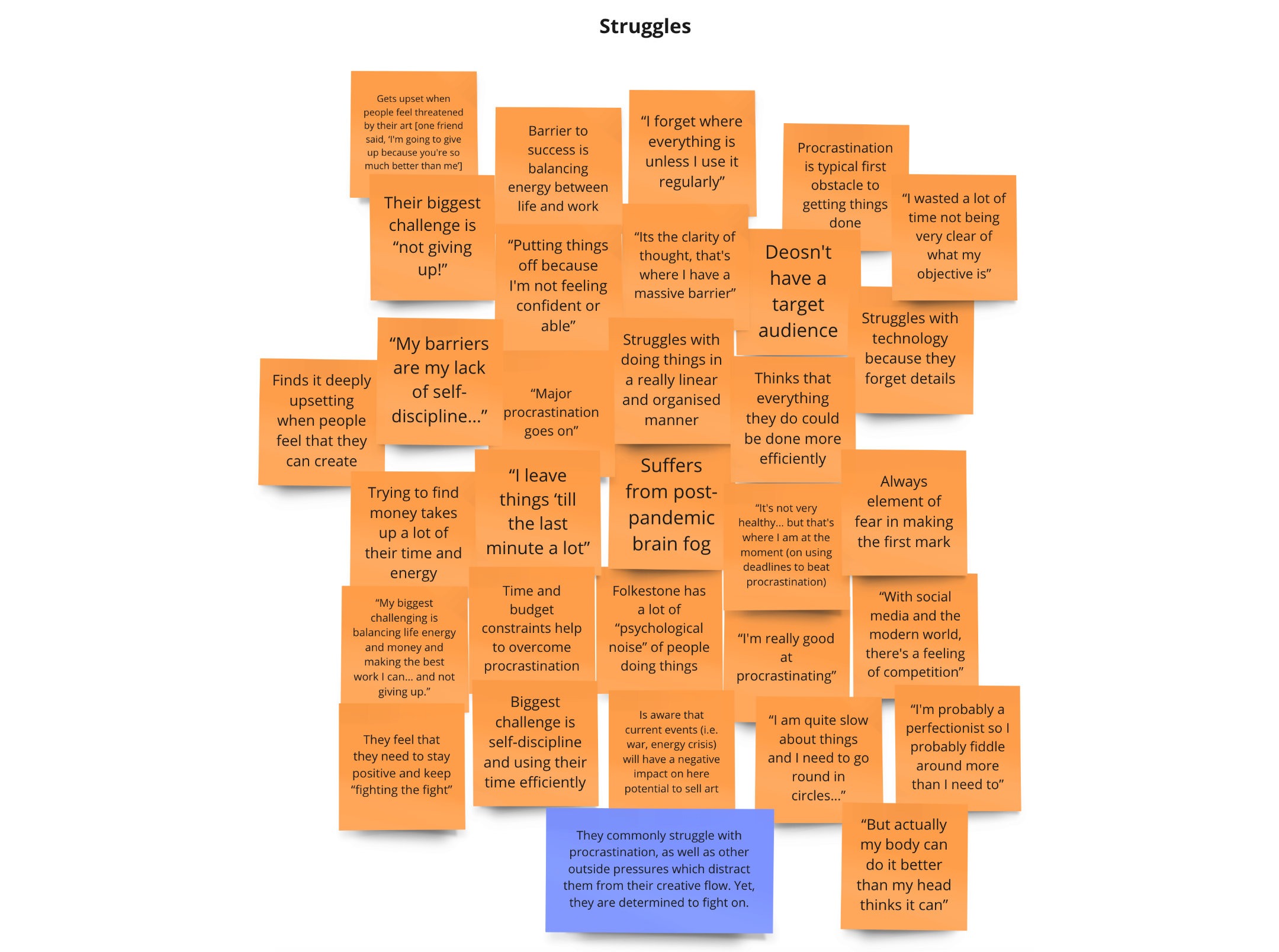 The first step of working with Kate was getting to know her as much as possible. We had a one-to-one video call where I asked her open-ended questions to assess her needs. There were no wrong or right answers to questions such as, ‘How does making art make you feel?’ or ‘What would an ideal day as an artist look like for you?’ but each response gave me insight into her personality, struggles, and goals. By the end of the interview, I had many interview notes, which I grouped into common themes and opportunities.