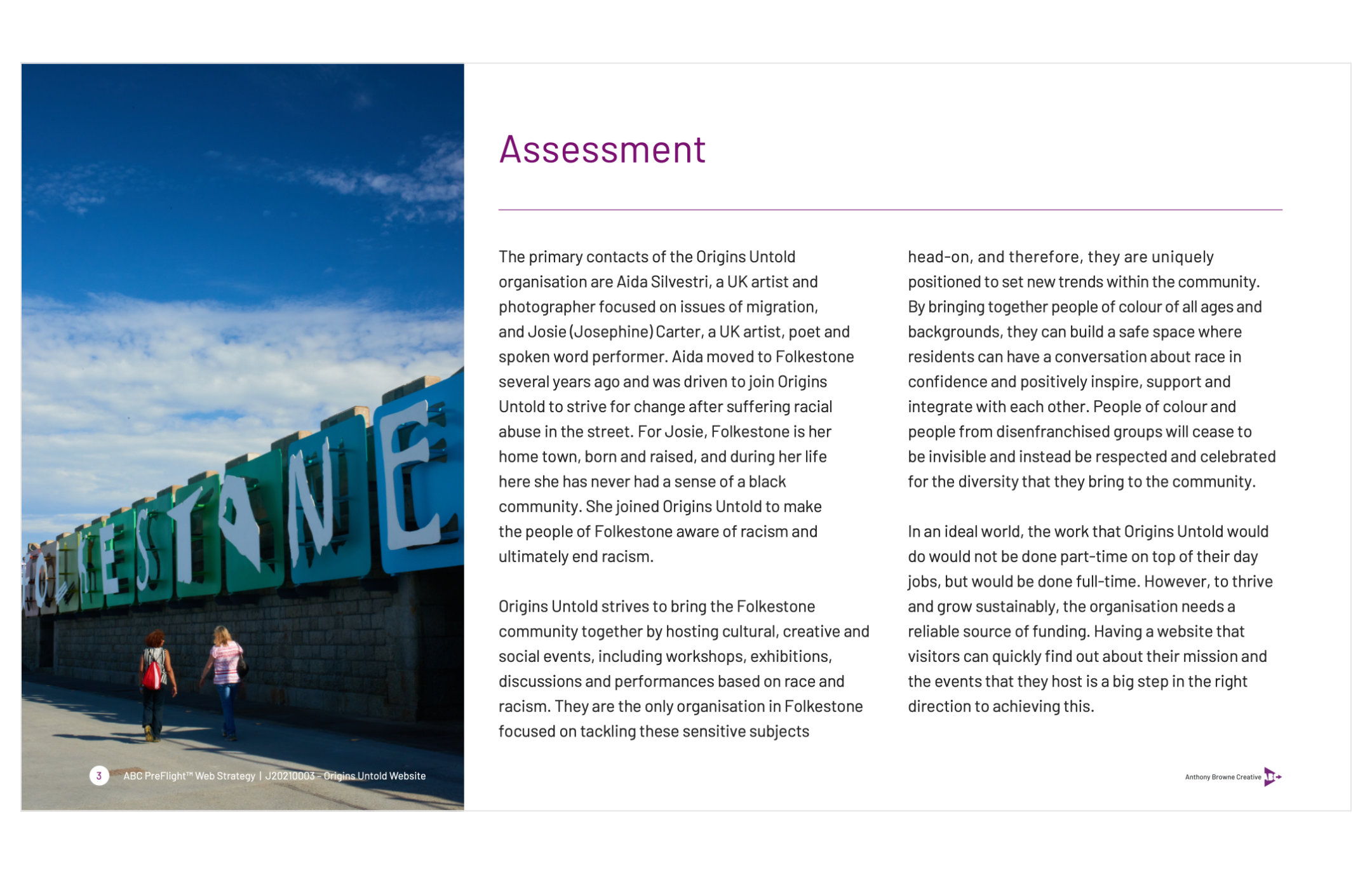 I invited Aida and Josie to a strategy session interview so that I could get to know them and the organisation as much as possible and, ultimately, define the website’s goals. By asking a series of open-ended questions such as, ‘What would you most want to change about living here [in Folkestone]?’ and “What would an ideal day look like for you working within Origins Untold?’, I was able to build a comprehensive snapshot of their current situation and where they aspired to be in the future.
