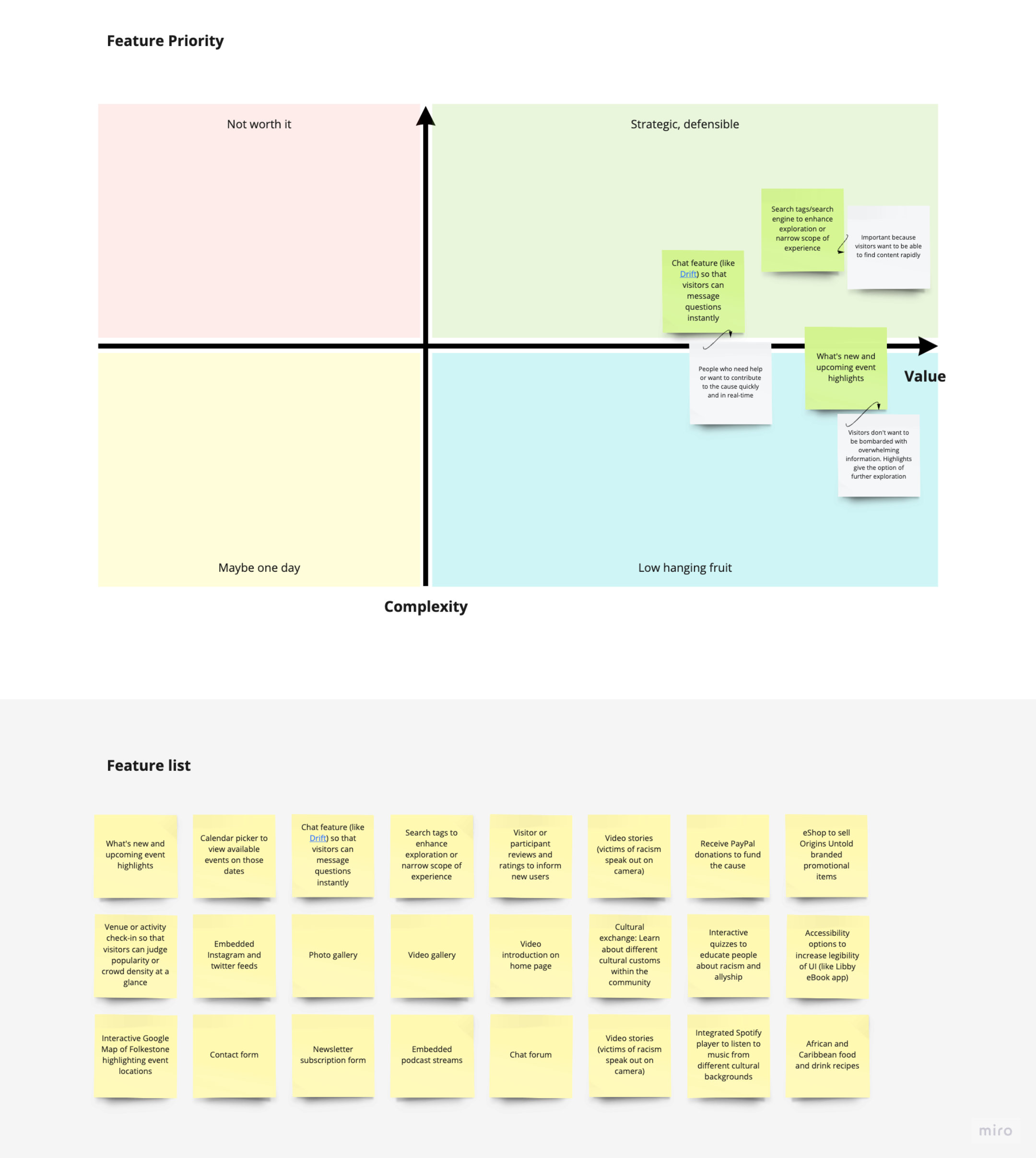 After the interview, I watched the recording, made Post-it Notes on a Miro board and then grouped my findings into common themes and opportunities. This research synthesis formed the foundation of the strategic plan to build their website, which I presented to them as a takeaway PDF document outlining my steps to bring them closer to achieving their goals.